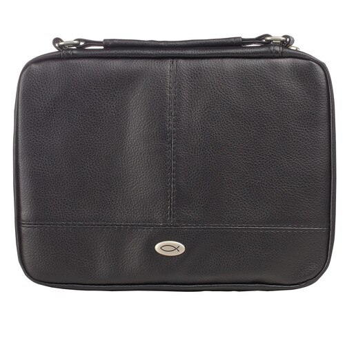 The front cover of the black faux leather cover is divided into three panels, each separated by a decorative double row topstitching. A silver oval badge is engraved with the classic Ichthus fish symbol and placed in the center of the bottom panel. Coordinating silver hardware secures the faux leather handle. The Bible case's two zippered compartments provide plenty of space for your Bible, a notebook, pens, paper, and more. The first compartment has a slip pocket to secure an included notepad. On the opposite side, you will find another slip pocket for loose paper, three credit card holder slots, and 4 pen loops. The second compartment has two slide-in pockets to securely hold the covers of your Bible, a zipped mesh pocket (M, L, and EL only), and an additional pen loop that holds a highlighter pen combo. Both compartments close with zippers with cross engraved silver zipper pulls. This Bible cover is available in six sizes: extra-small, small, thinline small, medium, large, and extra-large.